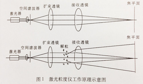 激光器发出的激光束,经滤波、扩束、准直后变成一束平行光,在该平行光束没有照射到颗粒的情况下,光束经过富氏透镜后将其汇聚到焦点上。当通过某种特定的方式把颗粒均匀地放置到平行光束路径中时,激光束经过颗粒时将发生衍射或散射现象,一部分光将与光轴成一定的角度向外扩散(如图l所示)。米氏散射理论证明,大颗粒引发的散射光与光轴之间的散射角小,小颗粒引发的散射光与光轴之间的散射角大。这些不同角度的散射光通过富氏透镜后汇聚到焦平面上将形成半径不同、明暗交替的光环,这些不同半径的光环包含着粒度和含量的信息。在焦平面上沿径向安装一系列光电接收器,将光信号转换成电信号并传输到计算机中,再用专用软件进行分析和识别这些信号,就可得到粒度分布。