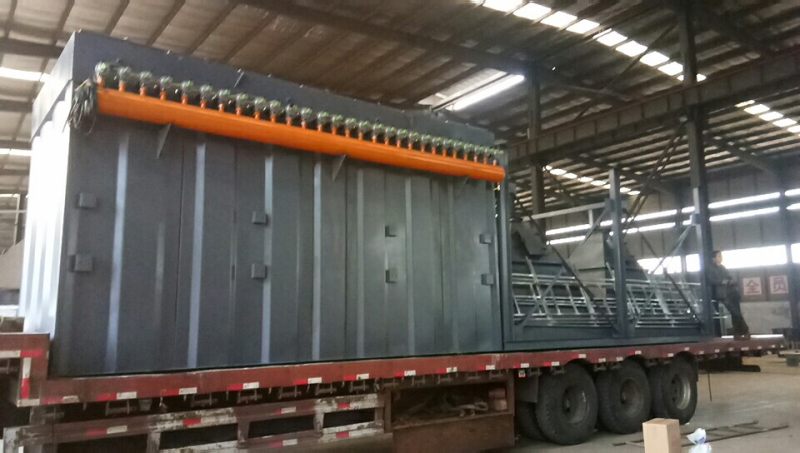 含尘气体从除尘器进出风箱体中的进风口进入经斜隔板转向至灰斗,同时气流速度变慢,由于惯性作用,气体中粗颗粉尘落入灰斗,细小尘粒随气流折而向上进入过滤室,粉尘附着于除尘布袋的外表,净化后的气体透过滤袋进入上部清洁室,由各分室清洁汇集经出风口,由除尘系统的主风机吸出而排入大气。