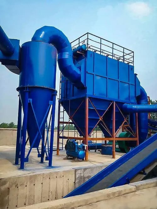 ⒉收尘、过滤系统:主要由滤袋、袋笼、花板组件、灰斗、切向进风系统组成。