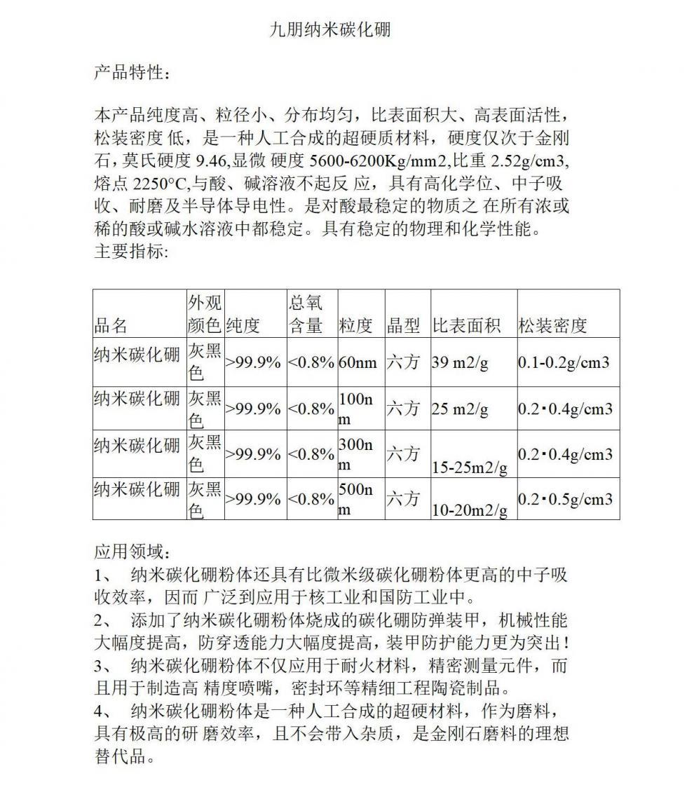 产地浙江 是否进口否 晶型锐钛型 货号CY-B4C1 级别其他 规格及用途200纳米 CAS六方纳米碳化硼 品牌九朋 特色服务CY-B4C1 型号CY-B4C1 规格60,200,300,500 产品名称六方纳米碳化硼 是否危险化学品否 商品描述