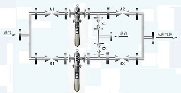 一备一用使用方法A过滤器使用①.打开A1 A2阀门,②.关闭B1 B2 Z1 Z2阀门,使用3天后A过滤器需要蒸汽灭菌时切换至B过滤器使用①.打开B1 B2,②.关闭A1 A2,③.打开Z1(蒸汽阀门) ④20-30分钟后关闭Z1,同样方式切换AB过滤器 交替使用,如有大疫情真空泵超负荷运行可以同时使用A B二台过滤器①.打开A1 A2 B1 B2阀门,②.关闭Z1 Z2阀门