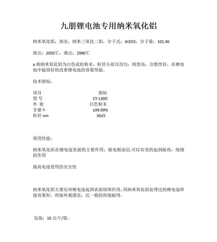 锂电池专用氧化铝 绝缘电极 涂层 隔热 耐高温 九朋L30D