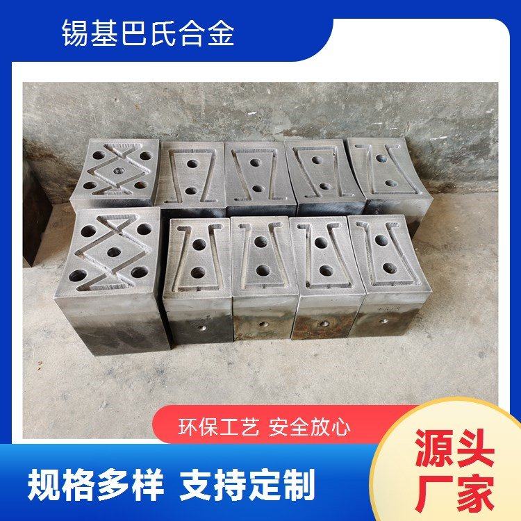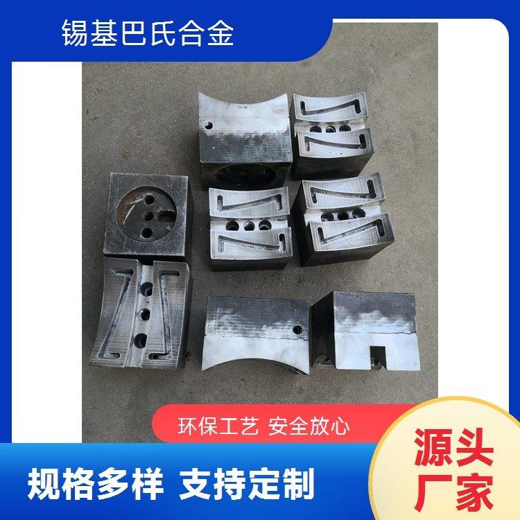 巴氏合金鋳块、滑动轴承合金鋳块,轴承合金又称巴氏合金、乌金、 白合金,其金相是在锡或铅的软基体中夹着锑、铜和硷土金属等硬质合金颗粒。它的减摩性能好,很容易和轴颈磨合。具有良好的避咬合性和耐腐蚀性。巴氏合金包含锡基合金zchsnsb11-6、4-4、8-4、8-8、12-4-10、15-2-18……;铅基巴氏合金zchpbsb20-15-1.5、16-16-2、15-5-3、15-5、10-6、1-16-1、10-15-1、10-5……两大类。适用于:造纸机械、建材机械、水电机械、选矿设备、船舶机械、化工机械、交通机械、钢铁机械、矿山机械、压缩机械、榨压机械、泵、风机等机械轴瓦轴套浇铸和电梯吊索具紧固、机床合金垫托瓦、机械密封、铸件充填……等用途。轴瓦和轴衬的材料统称为滑动轴承材料。浇注轧辊磨床静压托瓦巴氏合金轴瓦。轧辊磨床托瓦一般分接触式托瓦(动压托瓦)和非接触式托瓦(静压托瓦),轧辊磨床托瓦浇注材料通常选用巴氏合金铸造,因为巴氏合金有耐磨耐腐蚀性、有较好的顺应性、避咬合性和嵌藏性及减震性能等优点。接触式巴氏合金托瓦与轧辊支撑颈结合面接触大小是造成工作温度高低的原因,在运行中接合面要保持少量的润滑油使轧辊旋转顺畅减少直接摩擦而降低工作温度,温升过高损坏托瓦。非接触托瓦(静压托瓦)要保持油脂纯净、油路畅通使托瓦接触面油膜隔离不致接触面直接摩擦而导致温升过高损坏托瓦