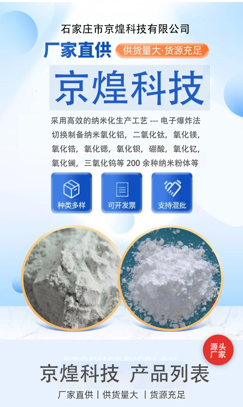 石家庄市京煌科技专业高纯、纳米新材料研发销售。纳米氧化铝、纳米氧化钛、纳米氧化锆、纳米氧化硅、纳米氧化钨、纳米稀土、纳米陶瓷粉、纳米金属粉、碳纳米管等纳米高纯材料。15931391033来经理