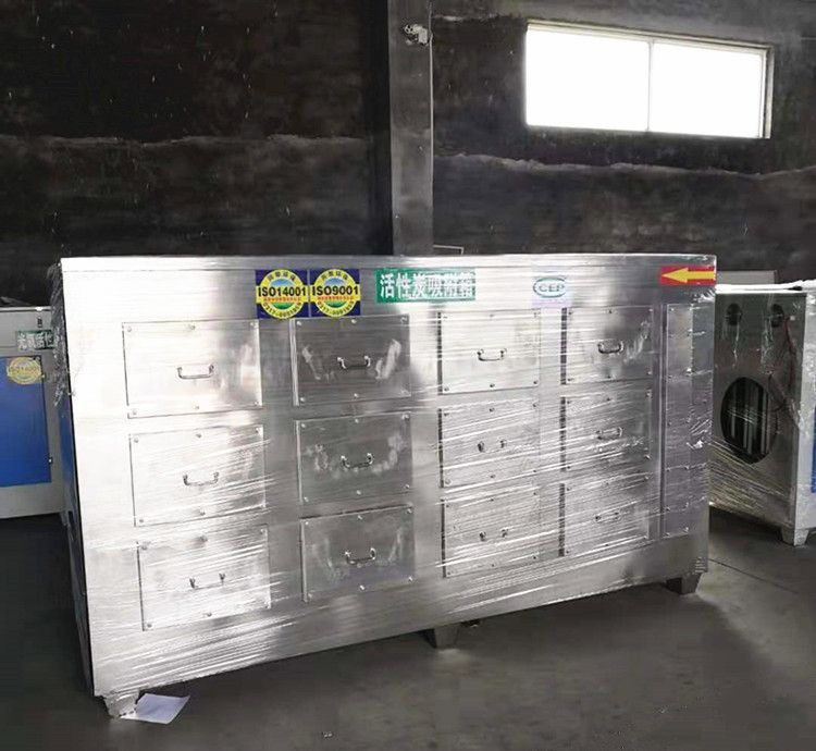 工作原理:废气处理不锈钢活性炭吸附箱主要利用活性炭的吸附能力来处理废气。活性炭是一种具有很大表面积的细小炭粒,其表面存在许多细小的孔——毛细管,这些毛细管具有很强的吸附能力。当废气由风机提供动力,负压进入吸附箱后,会进入活性炭吸附层。由于活性炭吸附剂表面上存在着未平衡和未饱和的分子引力或化学键力,因此当活性炭吸附剂的表面与气体接触时,就能吸引气体分子,使其浓聚并保持在活性炭表面,从而达到净化废气的目的。