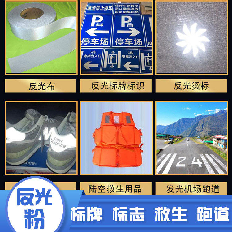 反光粉用于反光织物、反光涂料、丝网印刷、交通标志、反光材料、反光漆、反光油墨、广告宣传材料、服饰材料、反光膜(热贴膜、工程膜)、反光布、反光丝、反光革、反光标牌标识、机场跑道、反光片、鞋帽、书包、水陆空救生用品、夜间活动人员穿着等产品的必需材料,广泛用于道路、港口、矿山,消防等领域。