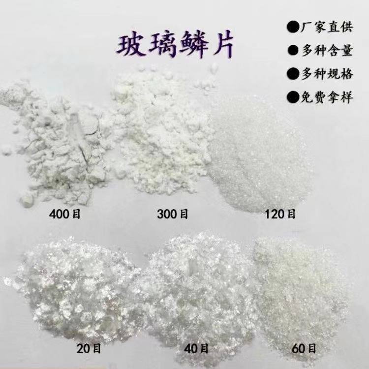 1.主要成分:Sio2 65-72% 2.外观:白色带光泽片状粉末 Glass flake