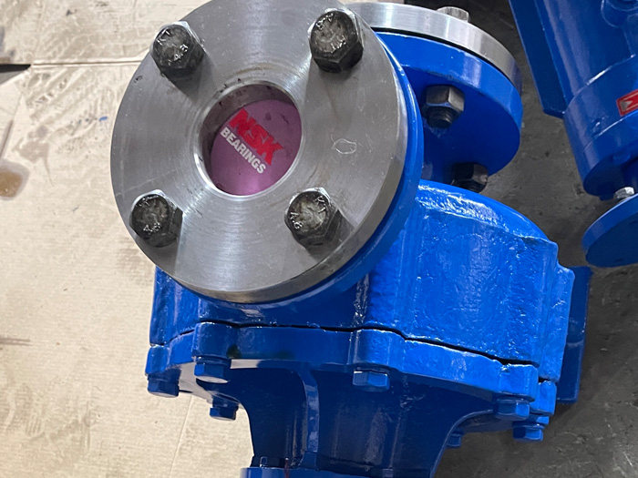 靠叶轮侧的球轴承安装时,高温导热油泵有防尘盖的一侧要朝向叶轮安装,开车前注入导热油润滑;靠联轴器侧的球轴承,用复合钙基高温润滑脂,该轴承重新安装时,热油泵有防尘盖的一侧同样要朝向叶轮侧安装,安装时充填润滑脂。