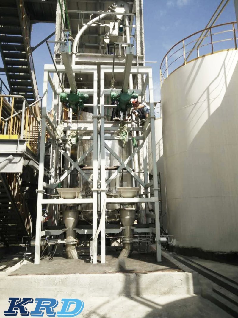 吨袋卸料站主要用于对吨袋包装的物料进行解包和卸料,卸料站用电动葫芦将吨袋提升到吨袋架上,打开流量控制阀和振动下料装置促使包装袋内的粉粒状物料通过自重落到下方料斗中。