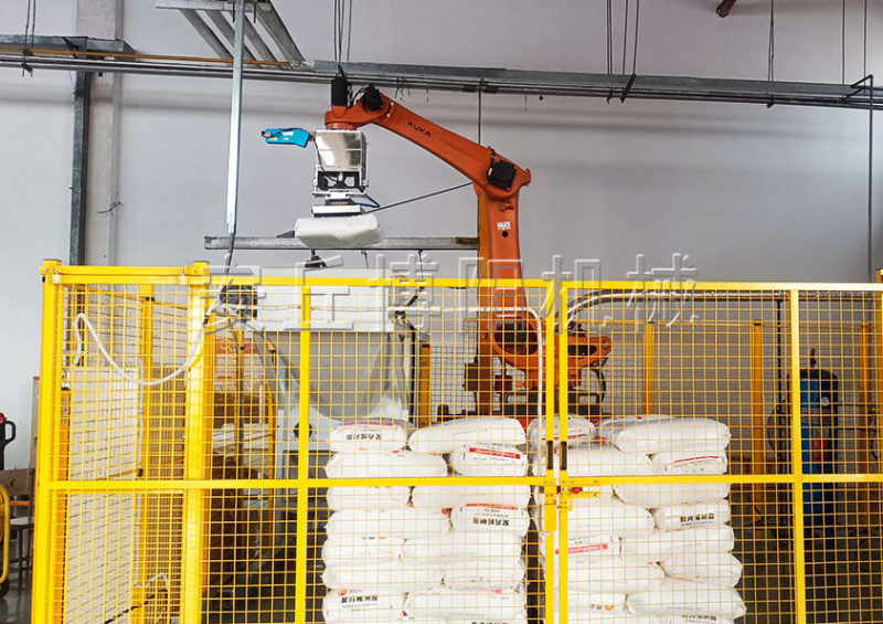 拆垛机器人通过3D视觉定位准确抓取托盘上的袋料(兼容10-50kg编织袋/PE袋/纸袋),放置于皮带输送机。