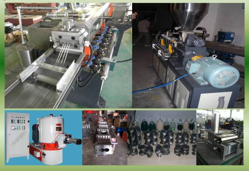 小型双螺杆塑料挤出机造粒机:双螺杆混炼机挤出机-熔体泵-成型模具-3辊成型机组-收卷.