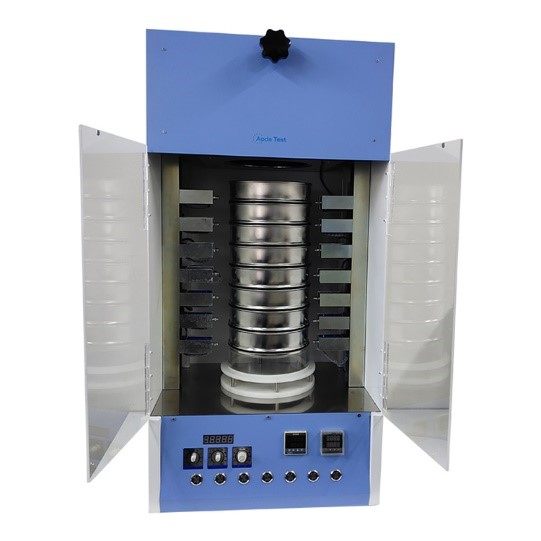 声波筛分仪在进行工作时,动力主要来源于声波发生器。在筛分实验进行前需将标准筛叠加成一个密闭的筛塔组合空间,声波发生器产生的声波会推动空气振动推片,将密闭的筛塔组合空间里的空气做上下提升运动,此时会形成一个柱状空气以3600次/分钟的振动频率带动空气在筛孔做上下提升运动,迫使筛网表面的粉末形成一种三维抛掷运动。堵住筛孔的颗粒会被反复提升重新定位让更小的粉末颗粒通过筛孔,空气的交替提升运动能协助其小于筛孔的粉末颗粒轻易得到筛分,较大的颗粒则会留在筛面上。