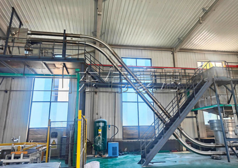 3.优化生产流程与空间利用:管链输送设备的灵活布局能力使企业能够优化生产线设计,特别是在空间受限的老厂房改造中表现突出。多点进出的功能简化了物料分配流程。
