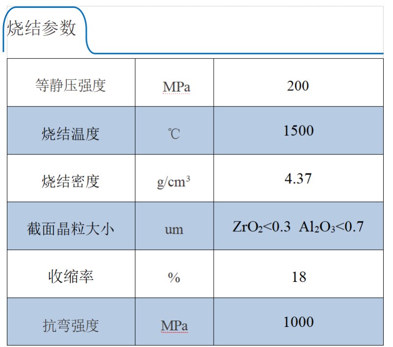 在我司制备高纯度纳米陶瓷粉体工艺基础上进行复合,制备纳米氧化锆增强氧化铝粉体,晶粒控制100nm以下,具体低温烧结特性,1500℃密度高于4.37g/cm3,四点抗弯强度高于1000MPa,具备优异的韧性和硬度、耐磨性、抗老化等特性。